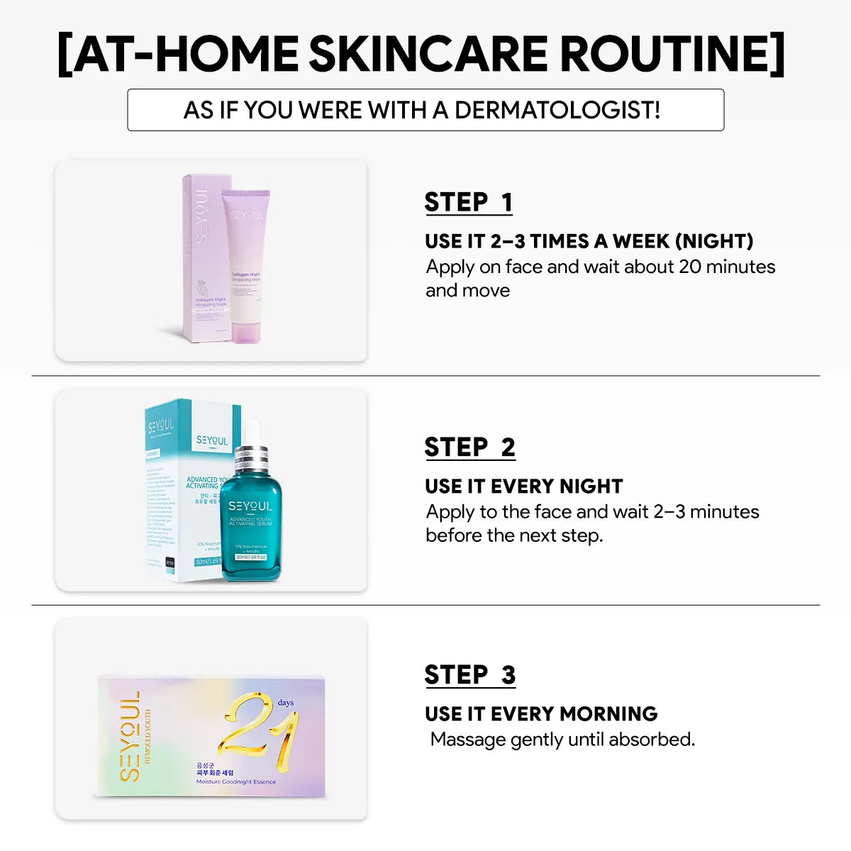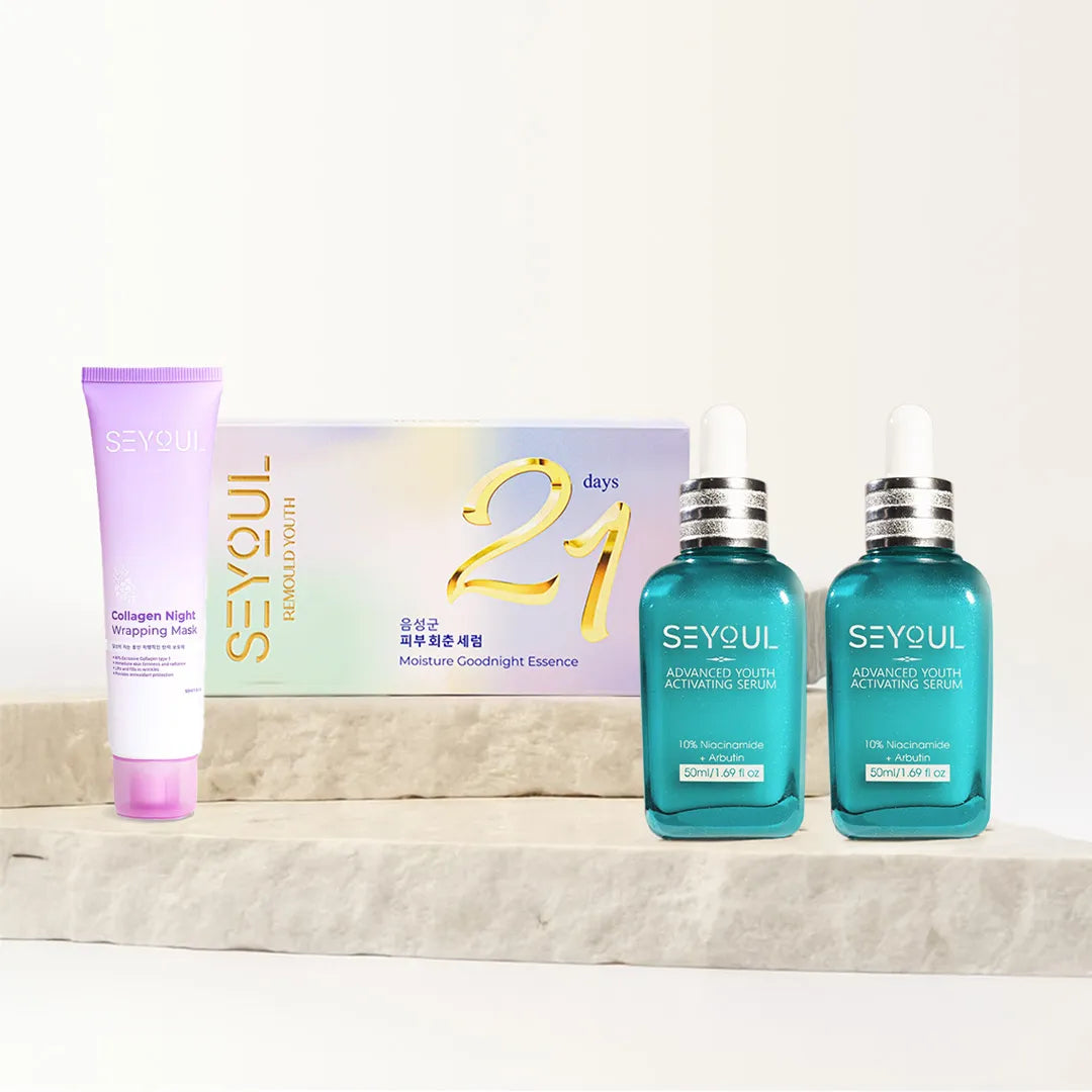 The ultimate 3-step routine to restore, brighten, and protect your skin every day. This combo repairs, hydrates, and boosts radiance from within. Enjoy firmer, smoother, and youthful skin – effortlessly at home.